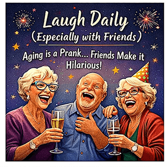 Rather than protest, I laugh — it seems to annoy it. And, for those that are younger – Aging keeps moving the goalposts. I keep laughing and pretending I meant to do that. I’ve discovered that laughing alone is fine — but laughing with friends is louder, longer, and usually someone spills a drink. Remember, friends are the people who laugh with you… and then remind you that you told this same joke last week.